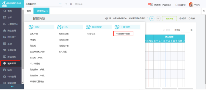 1、进入账套后,点击【税务管理】-【年报信息申报表】,工商年报取数是根据软件数据取数的。