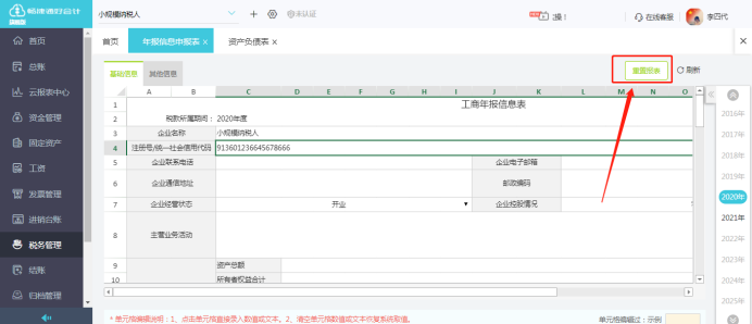 2、工商年报内企业名称以及纳税人识别号取数依据,来源为新建账套时填写的账套名称以及纳税人识别号。财务数据来源为财务报表(资产负债表以及利润表)