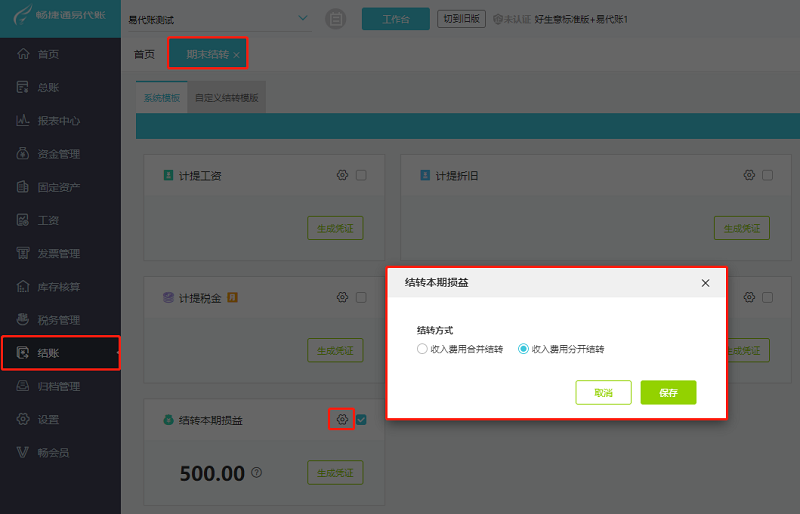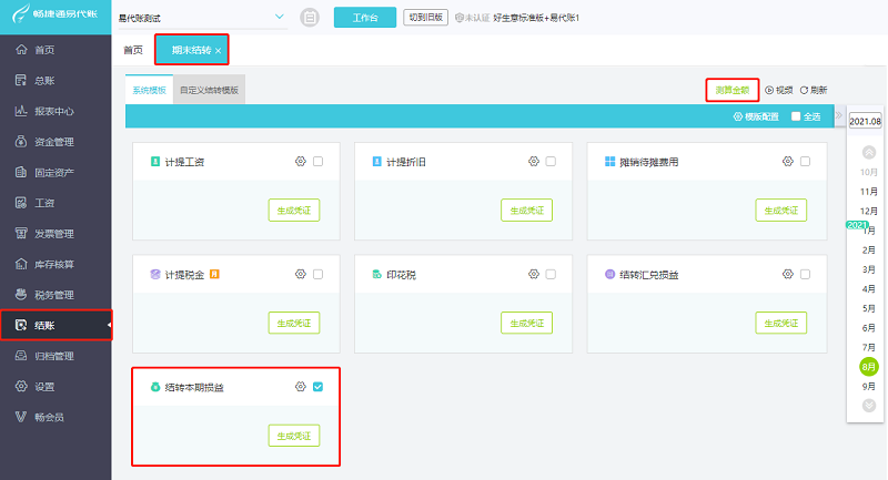 点击【结账】-【期末结转】,勾选【结转本期损益】然后再点击右上角的【测算金额】,系统会自动计算出结转金额,点击【生成凭证】-【保存】即可。