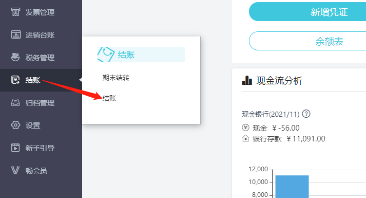 3.若检查无异常,则【结账】界面出现【结账】或者是【不结账】按钮,点击【结账】可完成本月结账。如下图: