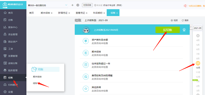 我们需要先反结账到启用期间1月份,点击【结账】-【结账】,右侧选择1月份,点击【反结账】,再去科目期初界面修改期初余额。