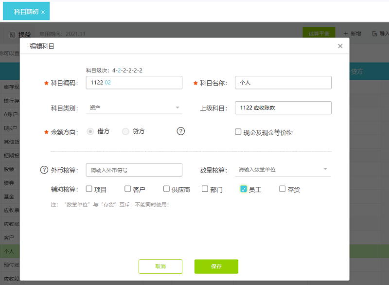 在二级明细科目客户上设置客户辅助核算,另一个二级明细科目个人上设置员工辅助核算