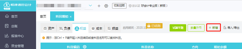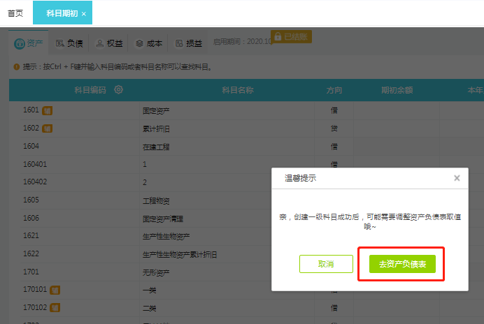 客户新增一个一级科目1406半成品,需要在【设置】-【科目期初】,点击右上角新增,创建成功后,系统会根据新增科目的类别弹出提示,如下图所示“亲,创建一级科目成功后,可能需要调整资产负债表取值哦~”