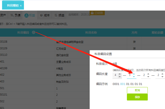 由此可以点击【设置】-【科目期初】,点击科目编码旁边的【小齿轮】,修改科目级次即可。