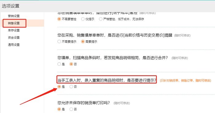 1、进入【系统管理】-【选项设置】-【销售设置】,找到【当手工录入时,录入重复的商品明细时,是否要进行提示?】勾选【是】按钮。