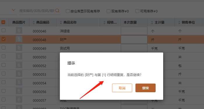 一般是怕自己做单据选到商品会选择重复,后面单据核销之后发现重复就很难修改,所以就希望做单据的时候选到重复商品可以有提示。(只针对销货单、销售订单)