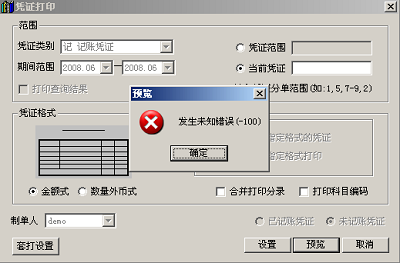 另外还有一个可能就是X:\WINDOWS\system32\UFCOMSQL\glpzjex.rep模板不存在,同样以用友T3用友能为例,如果我打印凭证是5行的非套打,那么对应的模板就是glpzje5.rep,如果这个模板不存在,那么打印时就会报 发生未知错误(-100)。(注意前面路径下的X:\为系统盘,glpzjex.rep为非套打模板,5行就是glpzje5.rep,6行就是glpzje6.rep,依此类推到20行。)