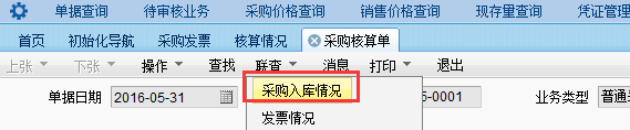 1、登录用友畅捷通T+软件,打开采购管理模块,通过采购发票联查出关联的核算单。