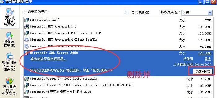 第一步,先去添加和删除程序里找到带SQL的程序,删除掉,或者用360软件卸载带SQL的软件,此处就不一一截图了(给一个sql2000数据库的图示,其他版本略有不同,只要带SQL就都删除掉),相信大家应该都会操作,如果没有用请参考下面的步骤继续操作;