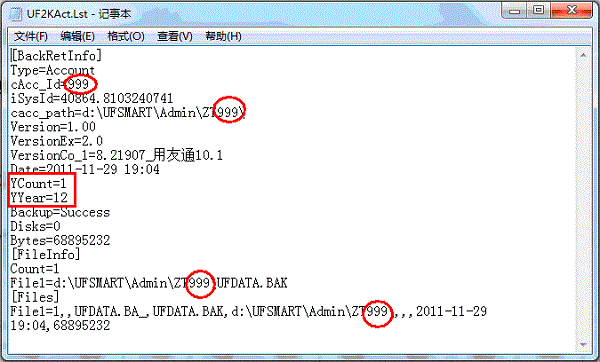 2、重装软件后,我们可以将演示账套999进行备份,备份后得到 ufdata.ba_、uf2kact.lst 两个文件,我们可以用记事本方式打开uf2kact.lst和第1步中输出U6的uferpact.lst进行对比。(特别注意一些年度账的情况,如果是单年度就比较好解决问题!)