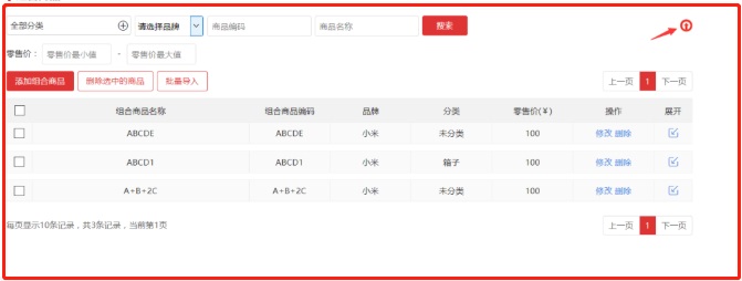 可以进行单个或批量删除,直接点击列表后方的删除按钮或者勾选多个组合商品信息后直接点击上出所选中的商品,给出提示,确定删除所选吗,确定删除成功。
