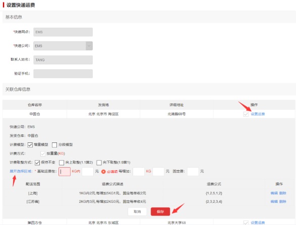 可以设置每个快递运费模板,如设置不同的配送范围设置不同的首重续重及首重运费和续重运费的公式。来计算预算运费和称重运费(计算好的订单净重运费和订单称重运费会在订单详情中显示)。