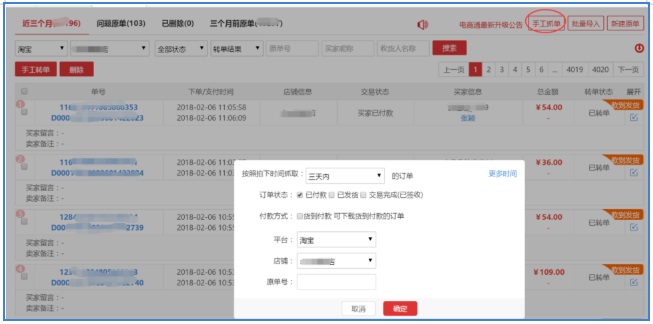 点击【手工抓单】是手工执行下载原单及将原单转化成订单处理中的单据。