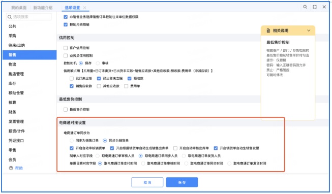 功能入口:系统设置>>选项设置>>销售>>电商通设置
