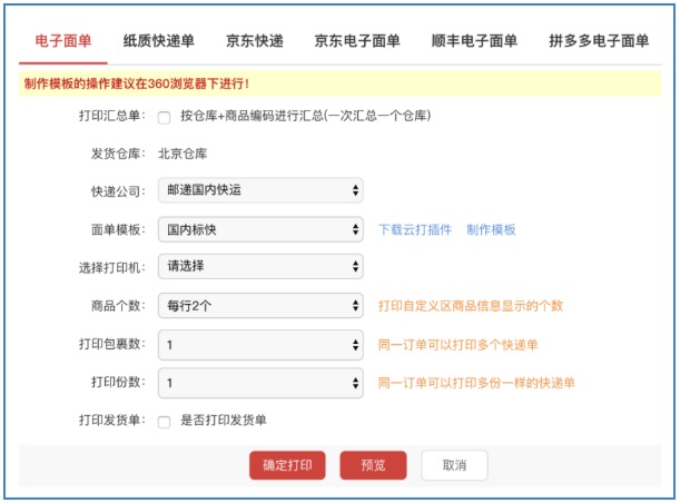 打印时支持汇总单、快递单、发货单一起打印(要选择不同的模板)。