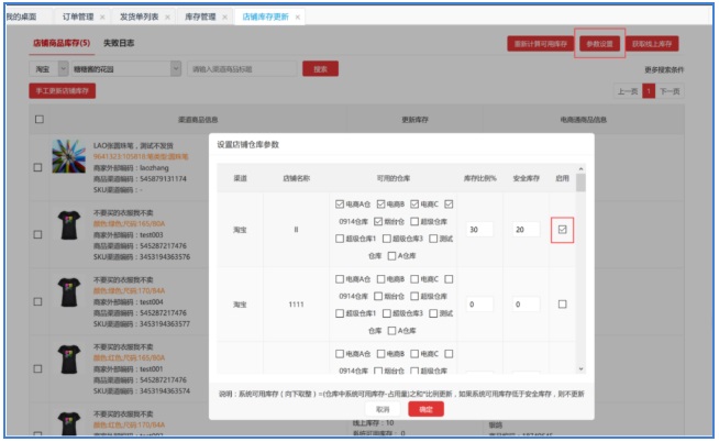 先点击【参数设置】,设置仓库和店铺的对应关系,及更新百分比,及启用更新。