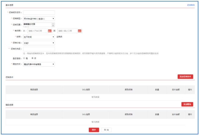 (1) 必填项:促销规则名称、促销类型、促销范围、有效期、按照拍下或付款时间、促销分组、赠送方式,添加促销条件的商品(包含数量)、添加赠品(包含数量)。