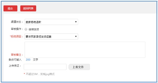 拒绝原因:在下拉列表中选择,拒绝原因有三个:要求买家承担发货运费、商品已经影响二次销售、申请时间已超过售后服务时限,根据实际情况选择。