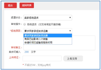 拒绝原因:在下拉列表中选择,拒绝原因有三个:要求买家承担发货运费、商品已经影响二次销售、申请时间已超过售后服务时限,根据实际情况选择。