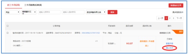 完成确认到货后,系统生成退款单,在退款申请中出现对应的单据,如下图所示。客服可以在退款申请里继续进行退款操作即可。