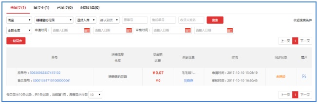 已同步:已经在T+生成相应单据后的电商通售后单据。