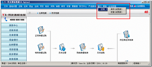 1、点击“窗口”--“注销”,把核算模块以外的模块全部注销: