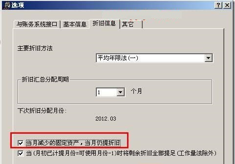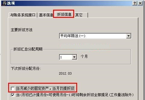 (1)点击“固定资产”——“设置”——“选项”,打开“折旧信息”的页签,取消勾选“当月减少的固定资产,当月仍计提折旧”。