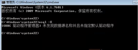 3、 重新启动电脑,先看DOS中连接SQL数据库是否正常:osql –E 会不会报错,如下图所示就表示正常了。