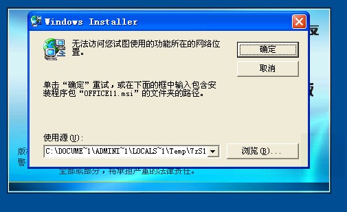 问题现象:从用友财务软件免费下载网站下载用友财务软件安装好之后,登录用友软件时提示如下图所示的错误:无法访问您试图使用的功能所在的网络位置。单击“确定”重试,或在下面的框中输入包含安装程序包“OFFICE11.MSI”的文件路径。如图所示。点击“确定”按钮依然停留在此界面,点取消,提示正在准备安装,再点取消,软件可以正常登录并使用。