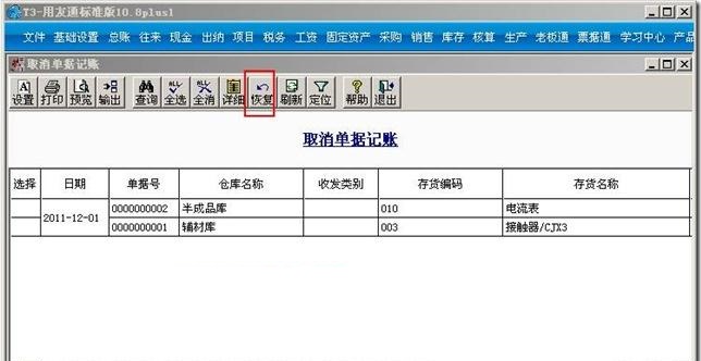 1、点击核算”--“核算”--“取消单据记账”,选中出入库调整单,点击“恢复”。