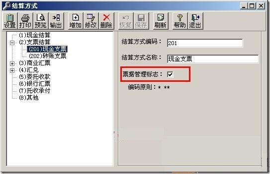 (2)点击“基础设置”-“收付结算”-“结算方式”把需要做支票登记的结算方式勾选“票据管理标志”: