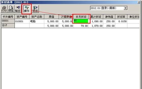 (1)点击“固定资产”-“折旧清单”,在折旧清单界面右上角,需要选择“2012.01(登陆)最新”之后才能修改,在键盘上同时按Ctrl+Alt+G三个键。“折旧清单”界面弹出“操作”按钮。