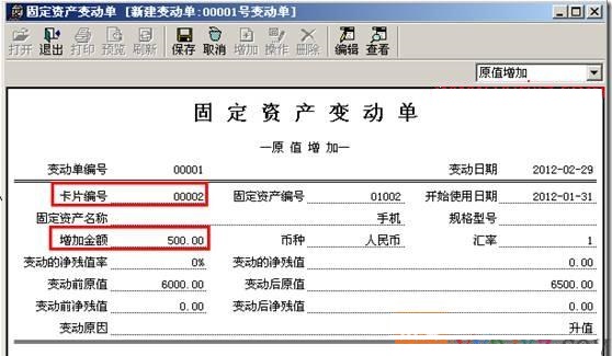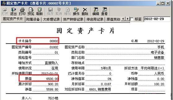(3)保存固定资产变动单之后,点击“卡片管理”查看00002的卡片,原值立即变动为6500。