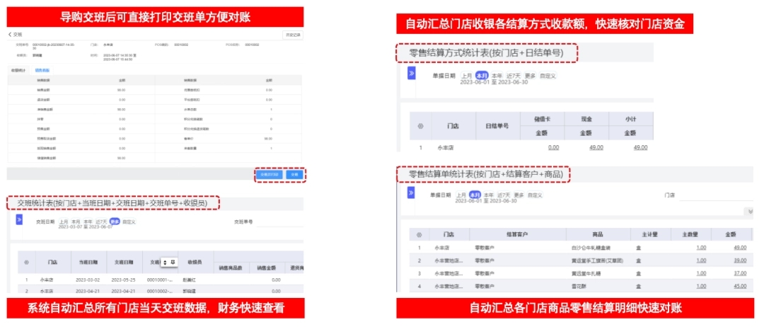 5、收银交班或日结后可直接将交班、日结明细打印出来,交给财务。财务人员通过后台可按门店+当班日期+交班日期+交班单号+收银员进行交班数据查询,并与门店提交的对账数据进行核对,通过结算方式统计表核对资金收支情况、通过零售统计表核对当天销售商品。