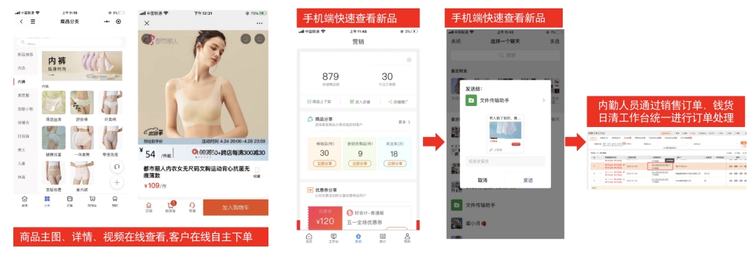 01业务难点1:商品推广展示、客户线上选货订货。商品上新、更新快,客户下单需要看品,公司上新后业务员发新品到朋友圈或私信客户,工作量大效率低,客户下单主要通过微信、电话形式,沟通成本高,效率低。