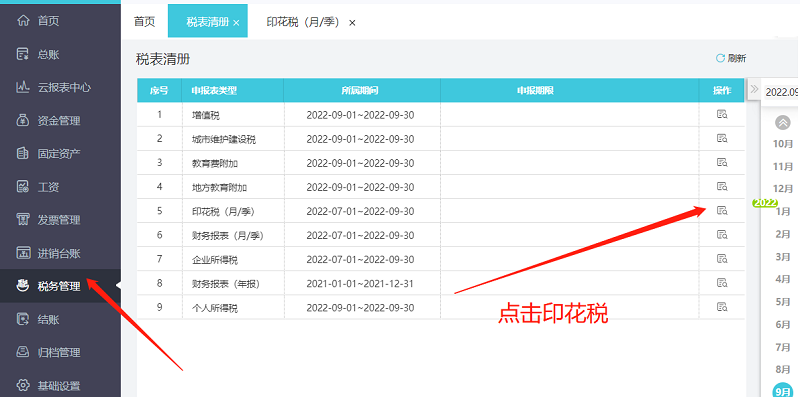 1、期末结转计提印花税金额是根据印花税申报表的金额取数的,进入 税务管理 税表清册 ,点击印花税,进入填写印花税申报表;