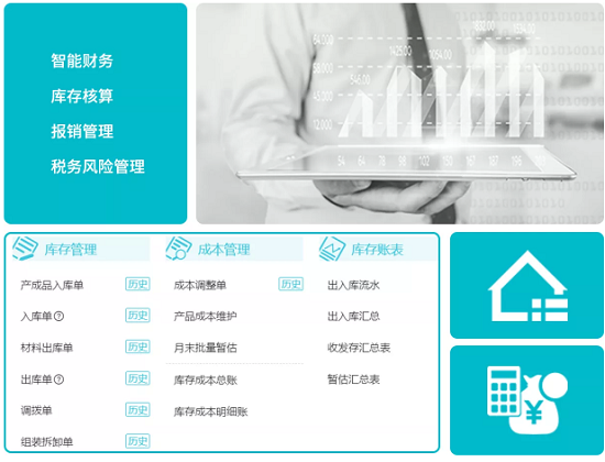同时包含多辅助核算、一键报税、发票管理、资金管理、工资管理、