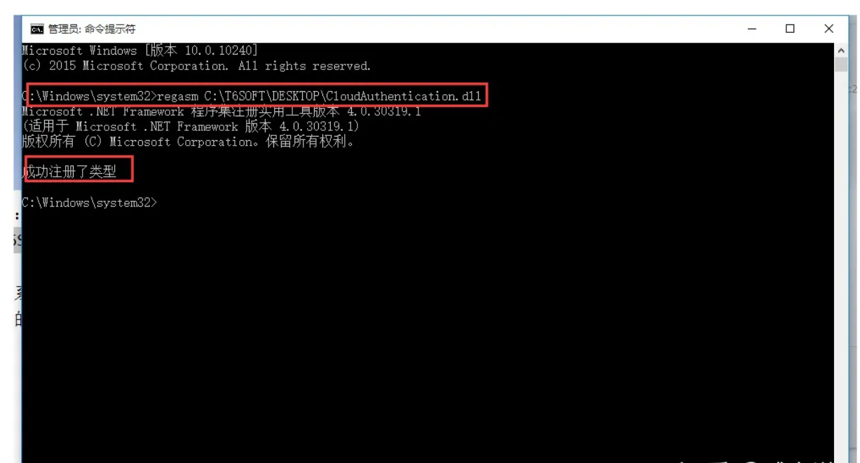 打开以后输入regasm + 空格 + CloudAuthentication.dll文件的路径