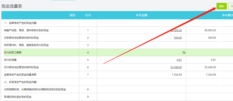 此处需要注意一下,现金流量表的期初需要单独录入,在【报表中心】-【现金流量表】右上角点击【期初】录入。