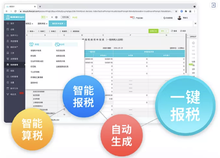 畅捷通好会计同步财税新政,可自动帮助客户计算税额,智能检测税务风险,自动生成报表,实现自动化、批量化、多税种一键报税,稳定高效、精确安全!