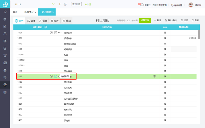 1.点击【设置】-【科目期初】,找准需要挂辅助核算的科目,如【应收账款】,点击【编辑科目】