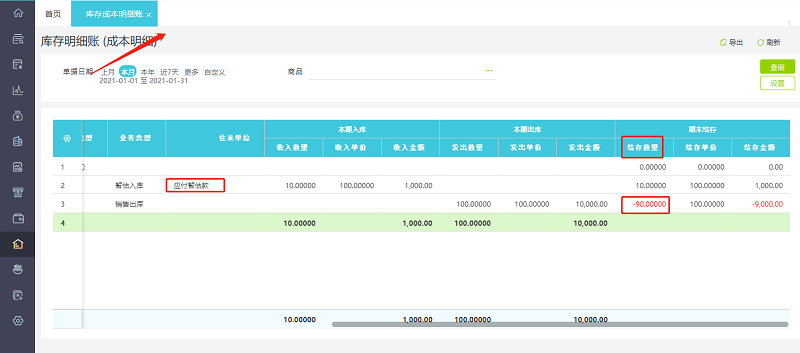 (方法二)月末批量暂估:当月可根据【库存成本明细账】中的结存金额为负数,点击批量暂估按钮,系统可自动生成一笔暂估入库单。