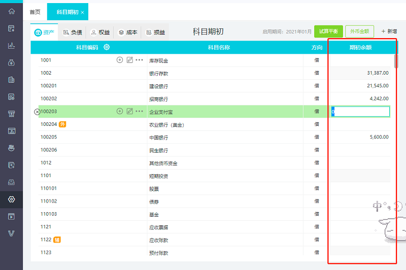 提示:科目期初数据填写遵循“由下往上”的规则,必须在末级填写金额,非末级科目是无法直接录入数据的。