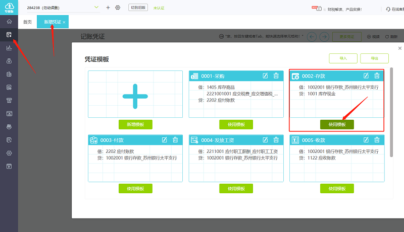 1.点击【总账】-【新增凭证】进入记账凭证页面,点击【模板】-【使用模板】或使用快捷键“F4”,调用已有的存款凭证模板。