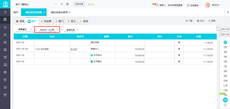1. 进入【总账】—【辅助核算明细账】,点击【客户】,选择需要查询的辅助项;