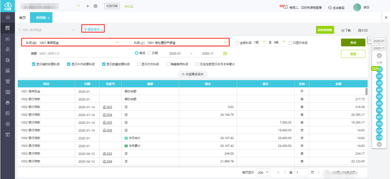 1. 进入【总账】—【明细账】,点击左上角【更多条件】,选择需要查询的【科目(起/止)】,如“1001库存现金-1901待处理财产损溢”,点击【查询】,可一次性查看资产类科目;