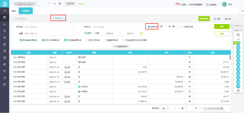 2. 进入【总账】—【明细账】,点击左上角【更多条件】,勾选【所有科目】,点击【查询】,可一次性查看所有科目。