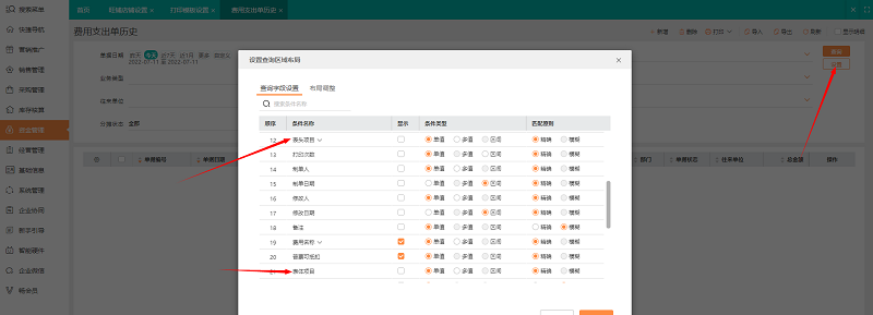 产品解决方案:在对应单据历史页面点击【设置】按钮,可勾选显示【表头项目】、【表体项目】筛选条件。