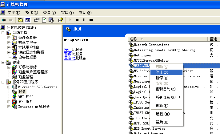再右击我的电脑图标,选择管理进入计算机管理界面,在服务和应用程序的服务中,将SQL服务暂时停止掉。