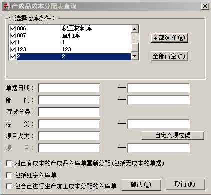 (1)点击“核算”--“核算”--“产成品成本分配”--“查询”,选择仓库,点击“确认”,勾选上单据,点击“确定”。